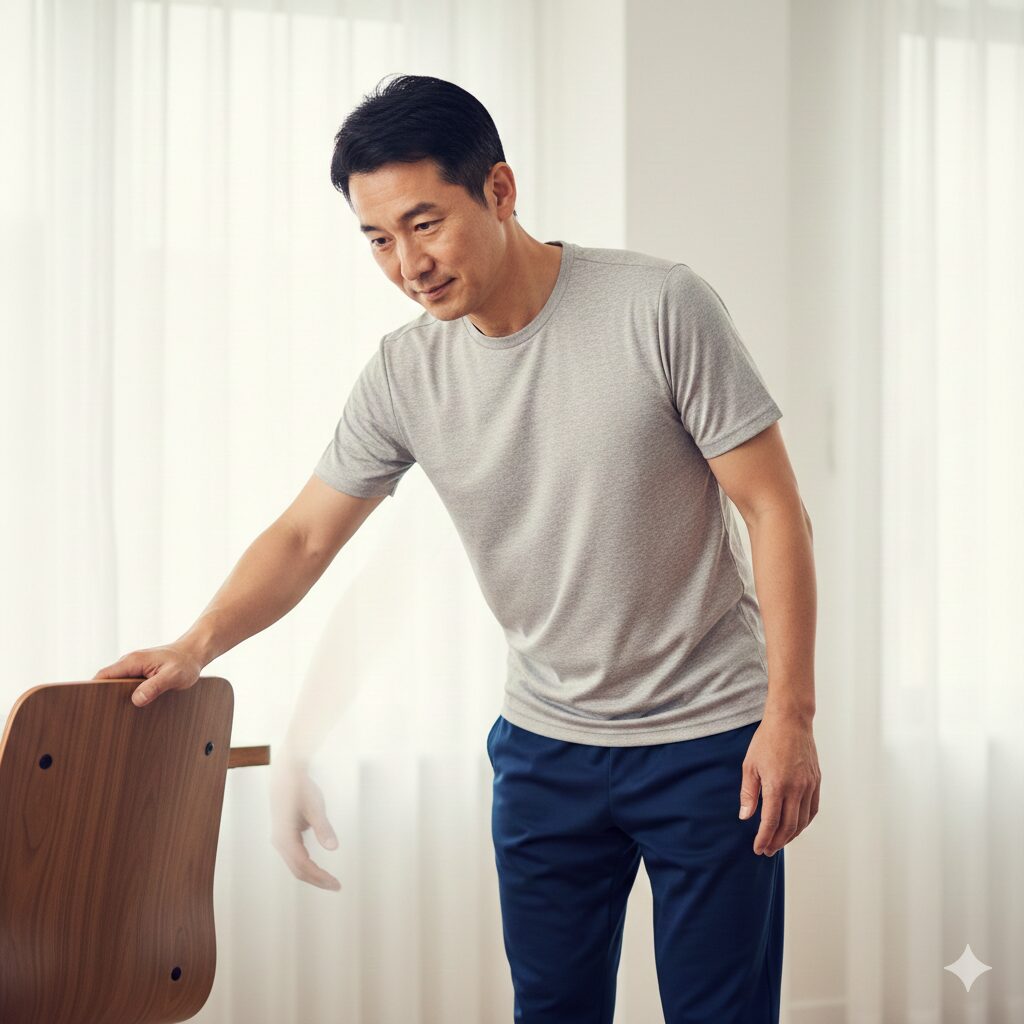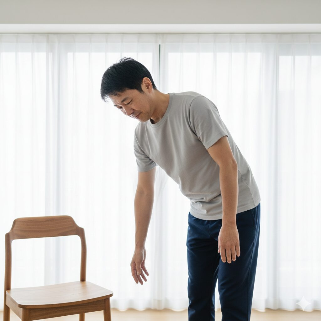 - 姿勢: テーブルや椅子の背もたれに健康な側の手をつき、体を前かがみにします。