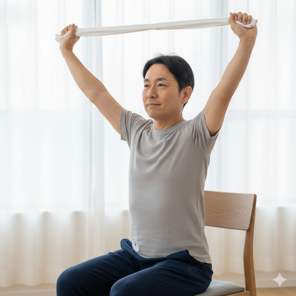 - 動作: 肘を伸ばしたまま、タオルを頭上に持ち上げ、「バンザイ」の姿勢になります。