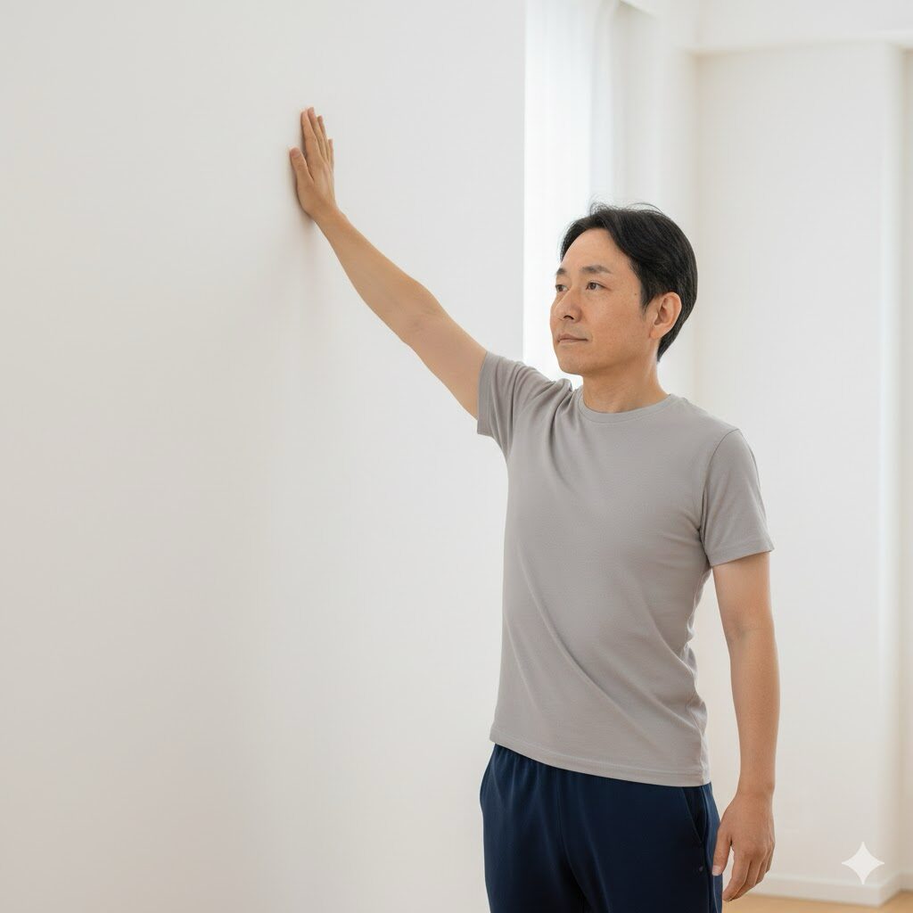 - 壁のぼり: 壁の前に立ち、痛む方の手のひらを壁につけます。指先で壁を伝うように、痛くない範囲でゆっくりと腕を上げていきます。