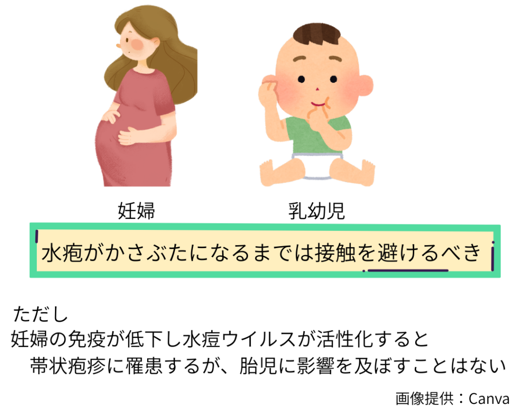 帯状疱疹は空気感染などで人にうつすことはありません。しかし水ぶくれの中にはウイルスが含まれているため、水痘に罹患したことがない人、水痘ワクチンを接種していない人がこのウイルスに接触すると水痘を発症する可能性があります。